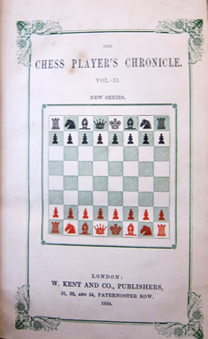 Staunton, H.: The Chess Player's Chronicle.Vol.II.[New Series]. London: W. Kent and Co.,1854. First Edition. L/N6123. vi,errata leaf, 392 pages in half leather and boards.