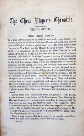 Staunton, H.: The Chess Player's Chronicle.Vol.II.[Third Series]. London: J .H. Starie.,1860. First Edition. L/N6123. 384 pages in half leather and boards.