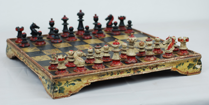 This type of set was popular in Austrian coffeehouses in the latter 19th and early-to-mid 20th centuries. This set is particularly early. King size is 6cm, board is 32x32 cm.