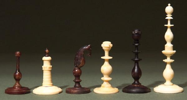 A GERMAN PLAYING SET, possibly Nuremberg, late 18th century The bone pieces stained brown and left natural, kings of tall form with multi-knopped stems, queens with caps and baluster knopped stems, bishops similar, but of smaller size, knights as arched horses´ heads, rooks as turrets with knopped finials, the king 9cm high, the pawn 4cm high, (one rook replaced). |