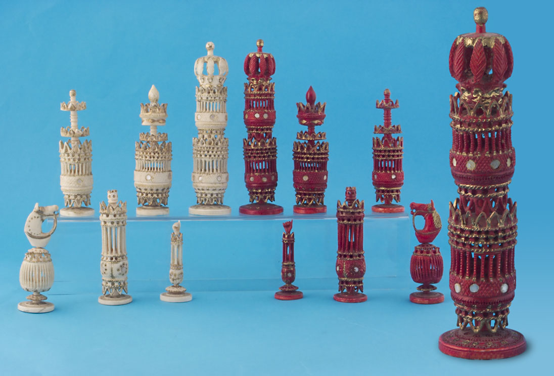 A fancy Mexican bone set, late 19th century or early 20th century. One side natural color, the other side stained plum red, all pieces with gilt highlights. Both sides have unusual inset abalone roundels to all the pieces. The set has striking similarities in design to the "Spanish Pulpit" sets. King 6 inches (15.2 cms). Click here for my Picasa album with photos of this set |