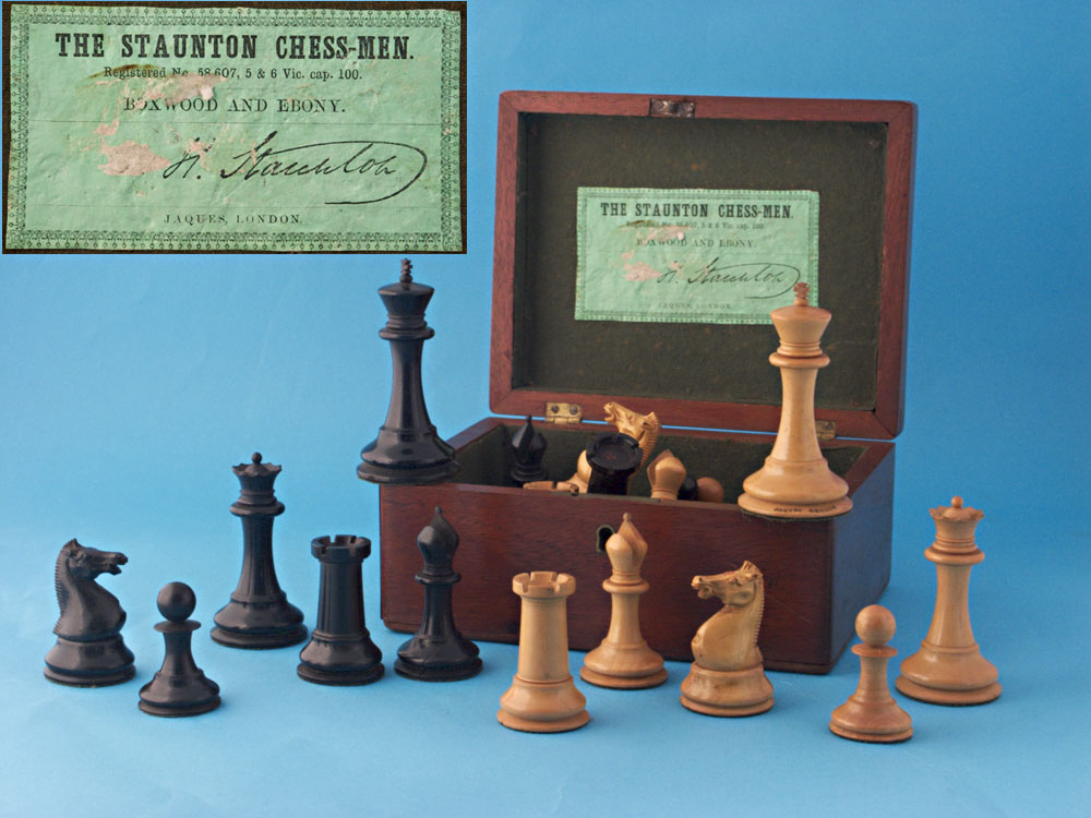 A Jaques Staunton boxwood-and-ebony set with Anderssen drop-jaw knights, circa 1855. Kings are 3.5".