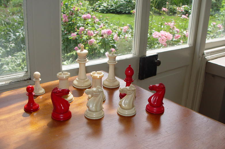 A Jaques ivory set, circa 1865, with 4" Kings. One red pawn is a replacement.